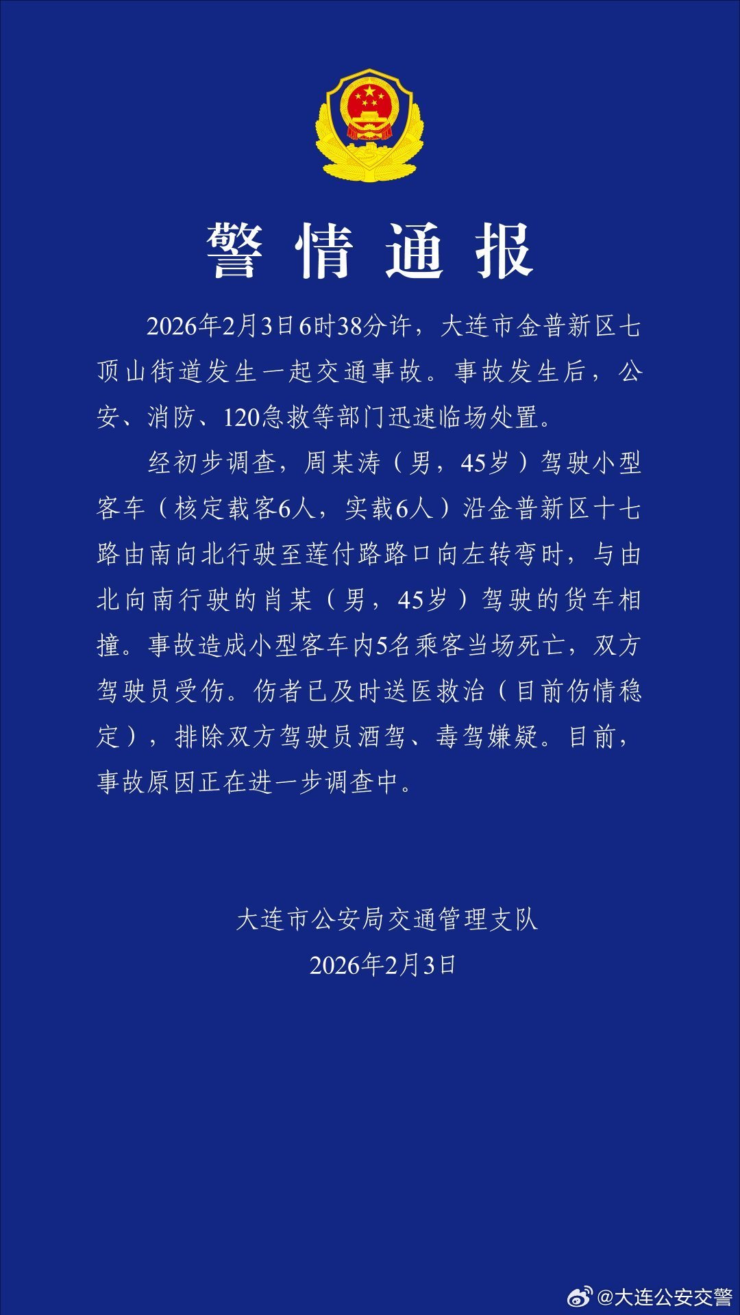 2026年2月3日6时38分许,大连市金普新区七顶山街道发生一起交通事故。事故发生后,公安、消防、120急救等部门迅速临场处置。